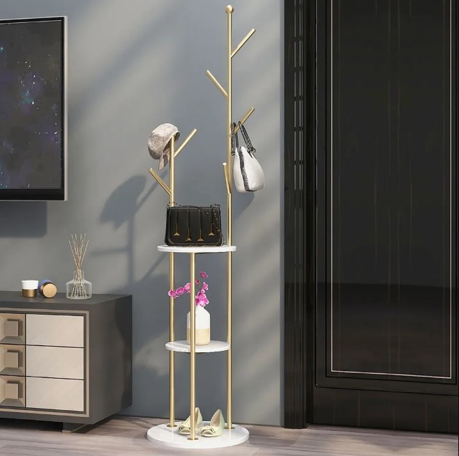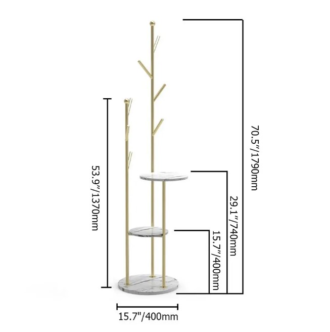 Rendez votre maison plus pratique et élégante en utilisant un porte-manteau en métal autoportant avec des étagères ouvertes qui ajoutera une touche de piquant au look chic. Il y a 9 crochets, trois plateaux circulaires composés de particules de marbre imitation, et une section de rangement pour les petites plantes d’intérieur sur le marbre de ce portemanteau de sol en métal peint or. De plus, la base triple largeur de ce porte-manteau assure robustesse et solidité. Les pieds du porte-manteau comprennent des embouts en marbre blanc pour éviter d’endommager votre parquet. Vous pouvez placer le porte-manteau contre un mur ou dans un coin de la pièce. Le style élégant de ce porte-manteau est parfait pour les intérieurs modernes et apportera un attrait organisationnel supplémentaire au foyer ou à la chambre principale.